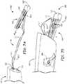 With reference toFIGS. 7A-B, which are perspective views oftether assembly600 in relation to handleassembly210, it may be appreciated thatgrooves604 facilitate a folding of lengths36-1,36-2, for example, per arrow F (FIG. 7A), in proximity to the secured proximal end36-p, aroundtether holder660, without tangling, whenpin portion664 is inserted intoreceptacle506. It may be seen inFIGS. 6 and 7A, that, according to some preferred embodiments,grooves604 extend along first and second sides660-1,660-2 oftether holder660. It should be noted that, according to some alternate embodiments, lockingportion663 oftether holder660 may only include oneaperture603 andcorresponding plug member63, and, likewise,pin portion664 may include asingle groove604 approximately aligned with thesingle aperture603.