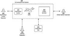 There may be more than oneglobal system operator106, and theglobal system operators106 may monitor and provide services formultiple distribution centers101,UAVs102, andservice requestors104. In some embodiments, one or more of theglobal system operators106 are trained UAV pilots, and theUAS100 may hand over control of aUAV102 to one such operator, temporarily or for the duration of a UAV mission.