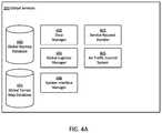 In the example embodiment illustrated inFIG. 4A, theglobal services103 are configured to serve a plurality ofdistribution centers101,UAVs102, andservice requestors104. In this embodiment, theglobal services103 comprise aglobal skymap database400, a globalterrain map database401, adatabase manager402, aservice request handler403, aglobal logistics manager404, an airtraffic control system405, and asystem interface manager406.