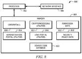 Thememory804 is operable to storecredentials808,cryptoprocessing utilities810,user permission data812, administrationportal utilities814,user portal utilities816, andsecurity policy data818, and/or any other data or instructions. Thecryptoprocessing utilities810, administrationportal utilities814, and userportal utilities816 may comprise any suitable set of instructions, logic, rules, or code operable to execute the function described herein. Thememory804 comprises one or more disks, tape drives, or solid-state drives, and may be used as an over-flow data storage device, to store programs when such programs are selected for execution, and to store instructions and data that are read during program execution. Thememory804 may be volatile or non-volatile and may comprise read-only memory (ROM), random-access memory (RAM), ternary content-addressable memory (TCAM), dynamic random-access memory (DRAM), and static random-access memory (SRAM).