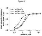 The purified MICA-α3-iFv proteins were tested in a FGFR3-binding ELISA to confirm simultaneous binding to the FGFR3 target and the NKG2D receptor. FGFR3 in phosphate buffered saline (PBS) was coated onto Maxisorp plates at 2 ug/ml concentration. Each MICA protein was titrated, allowed to bind FGFR3 for 1 hour, and washed to remove unbound sMICA protein. Bound MICA-α3-iFv protein was detected using NKG2D-Fc and anti-Fc-HRP conjugate.FIG. 6 shows that the binding of both MICA-α3-iFv.1 and MICA-α3-iFv.2 to FGFR3 was comparable to that of a MICA-scFv, made by fusing to the C-terminus of soluble MICA a traditional scFv constructed from MAbR3. These ELISA results also indicated that both the FGFR3 and NKG2D binding specificities of the scFv and the α1-α2 domain, respectively, were retained by the modified MICA and demonstrated that the iFv peptide inserted using different spacer formats was functional.