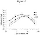 In order to understand the kinetic basis for the altered affinities, both the on-rates and off-rates for the α1-α2 variant NKG2DLs binding to surface coated biotinylated human NKG2D were measured using biolayer interferometry (Octet) at 100 nM of each of the modified α1-α2 proteins. Consistent with results from the IC50ELISAs,variants 16, 17 and 18 each displayed significant reductions in the off-rate (18-fold relative to WT), which is largely responsible for the affinity increase (˜30-fold relative to WT α1-α2)(FIG. 14; Table 3). Althoughvariant 15 displayed a similar slow off-rate as did 16, 17, and 18, its on-rate was decreased, resulting in an affinity stronger than WT butweaker variants 16, 17 and 18. Because the only difference between variant 15 (SEQ ID NO: 31) and 16 (SEQ ID NO: 32) was K125N versus K125L, the mutation at position 125 clearly altered the on-rate while the decreased off-rate was attributed to the H161R mutation. Therefore, while the selected set of NKG2DL mutations (Table 1) was used to increase the α1-α2 affinity for NKG2D through significant off-rate reduction, certain substitutions also altered the on-rate resulting in a range of incremental affinity increases that we showed in this invention to have differential activity in the NK cell-mediated killing assays as described below.