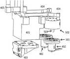 FIG. 5 shows a schematic view of the assembly shown inFIG. 4 with theprint head403 andsource crucibles402 separated from theinjection block401. In contrast to conventional OVJP arrangements, theorganic sources402 are close-coupled to the injection block, as opposed to being separate source cell vessels that are connected to other components with heated runlines, such as shown inFIG. 3.Source crucibles402 as disclosed herein may be attached directly to theinjection block401, for example, via support rings501 around the source crucibles. In such a configuration, the weight of the source crucible is physically supported by the injection block. Theattachment face502 on the underside of the injection block401 forms the upper “ceiling” surface of the source cell cavity containing the condensed organic material when thesource402 is sealed to theinjection block401.