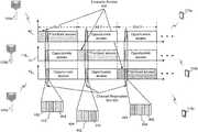 FIG. 4 is a block diagram illustrating shared communications over CBRS spectrum between PAL users,base stations105a-105candUEs115a-115c. The illustration of communication streams40-42 visually depict the streams as separate resources. However, this visual depiction is for clarity. Each of communication streams40-42 is the communication stream as seen by each of the communication pairs of the same frequency resources. Thus,communication stream40 represents the shared frequency resources as seen bybase station105aandUE115a,communication stream41 represents the same shared frequency resources as seen bybase station105bandUE115b, andcommunication stream42 represents the same shared frequency resources as seen bybase station105bandUE115b. Each of thebase stations105a-105cprovide communications for different operators.
