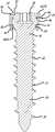 As depicted inFIGS. 13-15, theadaptor300 including abody portion302 that can be formed as an incomplete generally annular structure. Thebody portion302 includes afirst end304 and asecond end306 spaced apart by agap308, anupper surface310, alower surface312, anaperture314 extending between theupper surface310 and thelower surface312, aninternal cavity316 defined at least in part by theaperture314, and achannel318 communicating with theinternal cavity316. Thebody portion302 of theadaptor300 is resiliently flexible to afford further spreading of thefirst end304 and thesecond end306 apart from one another, a portion of thebody portion110 of thehub102 is ultimately received within theaperture314, and a portion of theflange134 of thehub102 is ultimately received within thechannel318. Furthermore, thelower surface312 can includevarious protrusions319 spaced therearound. As depicted inFIGS. 13-15, theprotrusions319 are spikes formed on (e.g., unitarily formed on) thelower surface312 and configured to engage bone. As depicted inFIG. 13, for example, thespikes319 can be formed as pyramids.