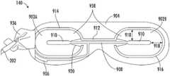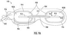 Referring toFIGS. 9A and 9B, illustrate an exemplary embodiment of theheating element assembly140 for use with an eye mask.FIG. 9A illustrates a front side of theheating element assembly140 including afront surface938 of a leftgraphene heating element902A and afront surface938 of a rightgraphene heating element902B.FIG. 9B illustrates a back side of theheating element assembly140 including arear surface940 of a leftgraphene heating element902A and arear surface940 of a rightgraphene heating element902B. Theheating element140, as described herein, is positioned in a therapeutic region covering both sides (right and left eye) of themask body110. Theheating element assembly140 is supplied with power by theelectrical cord202. In the embodiments shown inFIG. 9A andFIG. 9B, theheating element assembly140 comprises two graphene heating elements902 (e.g., left graphene heating element and right graphene heating element), a ground lead906-910 (e.g., earth ground), a positive lead912-916, and an electrically insulatingcover904 which encapsulates the two graphene heating elements902, the ground lead906-910, and the positive lead912-916.