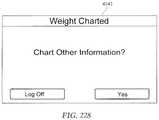 Now referencing the scale weighmenu structure2424 shown inFIG. 67, the process begins with thescreen4520 shown inFIG. 208 selection of thescale icon2598 causes the menu structure to advance toscreen4522 shown inFIG. 210. Selection of the weighvirtual button4524 advances the menu structure to screen4526 shown inFIG. 211. Selection of the virtual button to2566 causes the weight to be taken in thescreen4528 to be displayed as shown inFIG. 212. If a user chooses to select the savevirtual button4530 then the weight is saved as shown inscreen4532 inFIG. 213. The menu structure then advances toscreen4534 shown inFIG. 225 where user is prompted as to whether or not they want to chart the weight. Choosing yes which is associated with thevirtual button4536 will advance toscreen4538 inFIG. 226, if the patient is identified. If the patient is identified then there is a confirmation step where thevirtual button4536 needs to be selected again. Which causes the menu flow to advance toscreen4540 where the caregiver logs in and then the menu structure advances toscreen4542 to prompt the caregiver to decide whether to chart additional information or not. This is the path that occurs if there are no errors and no issues with information.