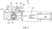 According to the embodiment shown inFIG. 5, theactuator158 anddeadbolt head150 are operatively coupled to adeadbolt guide250 which may be mounted in a deadbolt lock chassis. The deadbolt guide facilitates rotation of the actuator between unlocked and locked positions and movement of the deadbolt head between the extended and retracted positions. The deadbolt guide includes aslot202 which receives atab270 connected to the deadbolt head. That is, thetab270 is disposed on adeadbolt head linkage264 which is attached to the deadbolt head, so that the tab moves along theslot202 when the deadbolt head moves between the extended position and the retracted position.
