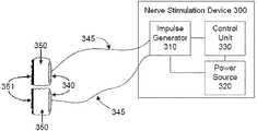 FIG. 1 is a schematic diagram of a nerve stimulating/modulatingdevice300 for delivering impulses of energy to nerves for the treatment of medical conditions. As shown,device300 may include animpulse generator310; apower source320 coupled to theimpulse generator310; acontrol unit330 in communication with theimpulse generator310 and coupled to thepower source320; andelectrodes340 coupled viawires345 toimpulse generator310.