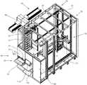 FIG. 9 shows thevessel collection device70 arranged below the section of theunloading device60 that is arranged outside of thestorage device2 in greater detail. This includes a vertical, elongated receivingspace71 in whichmultiple storage vessels3,3′,3″ are arranged on a vertically-movable vessel support72. Here, the emptiedstorage vessels3,3′,3″ are transferred through an opening in the bottom of theframe structure62 to thevessel collection device70, wherein the transfer process is described in more detail in a subsequent figure.