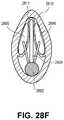 FIG. 28A depicts an embodiment of a valve flap expansion device and method. The embodiment includes twotool lumens2800/2801, which extend through the maintubular shaft2802. Bothtool lumens2800/2801 terminate inexit ports2803/2804 near the distal end of the maintubular shaft2802, separated by a radial offset. Twoexpandable dissection elements2805/2806 are advanced, one through eachexit port2803/2804, into theintramural pocket2807 until the full depth of the pocket is reached (as shown inFIGS. 28B-28C).