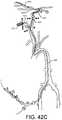 FIG. 41C shows advancement of theimplant delivery system915 with forward push at the RHV434 (point A) through the tetherable guide-sheath400 and out themouth508 near thetip406 and advanced into the tortuous distal carotid and cerebral anatomy. A distal tip of theimplant delivery system915 can be guided by the course of a previously-positionedprocedural guidewire910 and can encounter an area of tortuosity where it meets resistance (arrows near point B) in taking thecurve930. Further advancement of theimplant delivery system915 can lead to a downward reaction force that can buckle theimplant delivery system915 if used with a standard guiding sheath without any tethering. The tetherable guide-sheath400, however, being tensioned by thetether104 and thus, resisting prolapse from the reaction force, may buttress theimplant delivery system915 against the reaction force to prevent such buckling. Thus, anchoring at point C prevents prolapse and buckling of theguide sheath400 into the potential space of the ascending aorta or any of the descending aorta. The anchoring can occur both at theanchor102 deployed in the ECA, preventing downward movement, as well as in the CCA proper, preventing lateral movement.