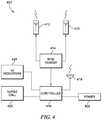 FIG. 4 is a block diagram of an embodiment of a moisture detection and alert system having a pair of receiving antennae, an RFID reader coupled to the receiving antennae, a controller coupled to the RFID reader, and the controller being coupled to a nurse call system, UI indicators and power;