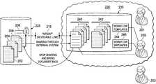 In the example ofFIG. 2, a copy (e.g., document208-C) of the document (e.g., document208) selected by the originator (through a UI element on the content server UI) for external sharing is made and sent to the external system (e.g., external file sharing system230). The external system stores the copy in its local storage (e.g., repository235). The external system may notify participants that the originator has shared the copy with them. The external system may also notify all participants when a new document version has been added (by any of the participants). Further, the external system may notify all participants when something changes in the document share.