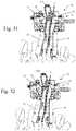 FIGS. 54-57 illustrate extreme angulation capabilities of thetissue retraction system10. Once the primary operative corridor has been established as described above, it may become necessary to alter the position of the operative corridor, for example to be able to access intervertebral disc material that otherwise would not be able to be accessed. With thetissue retraction system10 disclosed herein the angle of theoperative corridor4 may be altered without changing the surgical window at the target site—only the approach angle changes. This is enabled by the multiaxial movement capabilities of theretractor blades14,16,18. In this context, “multiaxial” means having the ability to pivot in a number of different directions relative to an initial position along one axis (or in a single plane). For example, each of theretractor blades14,16, has the ability to pivot in both a caudal and cranial direction. Similarly, themedial blade18 has the ability to pivot in a caudal and cranial direction. It is contemplated that theretractor blades14,16,18 may also be capable of polyaxial movement. In this context, “polyaxial” means having the ability to pivot in a number of different directions relative to an initial position along a number of axes (or in a number of different planes). Thus, blades may also be provided with the ability to pivot in a medial and/or lateral direction, or in a generally arcuate manner without departing from the scope of the present invention. Similarly, themedial retractor blade18 may also be provided with the ability to pivot in a medial and/or lateral direction, or in a generally arcuate manner without departing from the scope of the present invention.