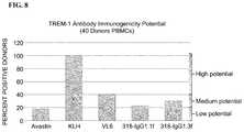 FIG. 3 shows that themAb 0318 variants do not agonize TREM-1 signaling as measured by the BWZ/hTREM-1 Reporter Cell Assay when a reporter cell line is incubated with (“Both”) or without CHO-CD32 (“BWZ 36 only”). The variant antibodies shown include: (i) 318-IgG1.1f (“IgG1.1f”), (ii) 318-IgG1.3f (“IgG1.3f”), (iii) 318-IgG4-Aba (“FcAba-4”), (iv) 318-IgG1-Aba (“FcAba-1”). The MAB1278 antibody, a known agonist of TREM-1 signaling, was used as a positive control antibody (see inserted box). The 5C8 (isotype control) antibody was used as a negative control.