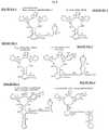 FIG. 6 illustrates exemplary secondary structures of RNAs used herein, seeFIGS. 2A-C for examples, with certain structural regions denoted as P (paired), J (junction), L (loop), and IL (internal loop). Naturally derived sequences are shown with accompanying Rfam accession numbers, and the secondary structure of wild type env8 (variant A) is based on crystallographic data [reference 1]. Nucleotides that are colored red in variant AT,MUTrepresent point mutations made to the binding core of wild type env8 that abrogate cobalamin binding. Nucleotides that are colored red in variant B represent point mutations derived from wild type env8 that have been shown to increase the affinity of this RNA [reference 2] for forms of cobalamin similar to the conjugates used herein. Features that induce bulkiness of the RNA include P13 for variant A, P7, P13, P14 for variant B and P7, P2, P13 for variant C. Variant D is an LA and P7-optimized variant B that improved cobalamin affinity, see alsoFIG. 13A-C).