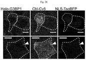 FIG. 3A shows an exemplary experimental strategy of labeling the Halo-tagged G3BP1 SG marker protein with the red fluorescent JF585 dye, followed by bead loading the Cbl-fluorophore probe, induction of SGs by arsenite for 30-45 min and live cell imaging.