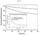 FIG. 16 shows exemplary photobleaching of RNA/probe complexes. Droplets containing the indicated RNA/probe complexes were constantly illuminated on a wide field microscope. The excitation rate (the number of absorbed excitation photons, determined from the extinction coefficient) were the same for each sample (see Table 10 for a summary of experimental conditions). Representative background subtracted and normalized fluorescence decay curves for each sample are reported. Inset: Photobleaching for the first 1 second.