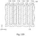 FIG. 13B is a view for explaining the process for manufacturing the trench capacitor according to one embodiment of the present invention, illustrating the process step of forming the trenches in the base member.FIG. 13B shows an XZ section of part of the base member provided with the walls, some of which include a narrow portion having a decreased width in the X-axis direction.