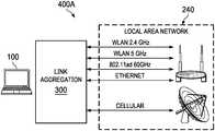 FIGS. 4A-C are block diagrams of use-case examples, according to some embodiments. Particularly,FIG. 4A showsenvironment400A whereIHS100 executesmulti-link aggregation software300 to accesslocal area network240.Multi-link aggregation software300 may be further configured to determine when to use single or multiple links (using multiple links is helpful only when the primary communication link is under contention), for example, usingmethod500 ofFIG. 5.