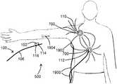 The “bipolar method” refers to usingdevices100 of the present disclosure whereby at least one, and in certain embodiments preferably only one, detection electrode and at least one, and in certain embodiments preferably only one, excitation electrode are used ondevice100, and where two other electrodes (one excitation and one detection) are used but not ondevice100, such as in connection with sheath(s)600 and/or pad(s)700. Such a bipolar method could be performed using a combination ofdevices100,sheaths600, and/or pads700 (which compriseexemplary systems500 of the present disclosure), as shown in, for example,FIG. 19B, which shows anexemplary system500 whereby onepad700 includes an excitation electrode110 (or another numbered excitation electrode) and whereby theother pad700 has a detection electrode114 (or another numbered detection electrode), and whereby adevice100 is used comprising the other excitation electrode112 (or another numbered excitation electrode) and the other detection electrode116 (or another numbered detection electrode).FIG. 19C shows yet anothersystem500 embodiment having componentry shown therein suitable to permit the bipolar method to be performed. As shown therein,FIG. 19C shows apad700 with anexcitation electrode110 positioned therein and positioned at or near the patient's wrist, with theother pad700 with adetection electrode114 thereon positioned near the patient's heart.Other pad700 positions are potentially used as referenced herein, such as on the patient's torso, arm, and/or leg, for example.