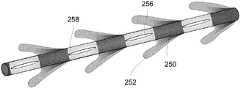 In certain embodiments such as is depicted inFIG. 19, the locations of the apertures are visually identifiable via a distinctive coloring or by placement in one of a plurality oflocator bands258 having visually identifiable distinctive coloring. The visually identifiable color may be accomplished by a dye that provides a different visual signal than aperture free portions of the suture. In certain embodiments the identifiable color is provided by dye such as a fluorescent dye that provides a distinctive location signal when activated by an exciting wavelength of electromagnetic radiation and is visually distinctive even in a surgical field obscured by blood. Fluorescent dyes may include, without limitation, any biologically compatible compounds that can be excited to emit light including cyanine-based fluorescent dyes such as, for example, indocyanine green (ICG), IRDye 800CW, ZW800-1. Other fluorescent dyes include but are not limited to fluorescein, indomethacin derivatized naphthalimine, protoporphyrin IX, and heavy metal free quantum dots.