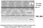 In contrast,FIG. 20J shows that the intensity of the e-fields in the direction of propagation of the electromagnetic waves is weaker in the region of the water film. The lower intensity is depicted by the darker color in the region of the water film. The lower intensity is a result of the e-fields being polarized mostly perpendicular or radial to the water film. The radially aligned e-fields also are highly concentrated in the region of air as shown inFIG. 20H. Thus, electromagnetic waves at 40 GHz (having a TM01wave mode) produce e-fields that induce less current in the water film than 45 GHz waves with the same wave mode. Accordingly, the electromagnetic waves ofFIG. 20J exhibit properties more suitable for reducing propagation losses due to a water film or droplets accumulating on an outer surface of an insulated conductor.
