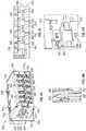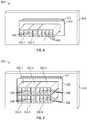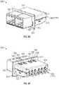 As also shown inFIG. 9K, and as shown in more detail in the side cross-sectional view ofFIG. 9M,fingers946 onupper sub-shell914 andfingers948 onlower sub-shell916 are interposed betweenoptical fiber cables950 extending rearwardly from opticalfiber jumper connectors934 inserted intorear portions906 of multi-bayoptical housings902. (For clarity in the figures, the reference numeral “950 (TYP.)” is used to designate one of the plurality ofoptical fiber cables950 shown in a given view).Fingers946 and948 have tapered lead-infeatures952 and954, respectively to facilitate engagement of upper sub-shell914 withlower sub-shell916, and are interference-fitted to form overlapping conductive fingers to minimize EMI/RFI holes of the assembled shell structure comprising upper and lower sub-shells914 and916. Foldedtabs958 and959 are also to provide overlapping conductive flaps to minimize EMI/RFI holes.Fingers946 and948 andfolding tabs958 and959 are to minimize orifice sizes to in turn prevent EMI/RFI leakages, especially when sub-shell shapes are stamped and folded. In some examples, molded conductive sub-shells may be constructed using conductive materials, including metal, conductive plastic, etc., where folded tabs may not be needed. In some examples, gasket strips may sandwiched between conductive sub-shells. In some examples, conductive sub-shells may be mated with tongue-and-groove structures.