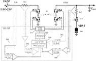 According to certain aspects, the present applicant recognizes various problems afflicting conventional battery chargers such as that shown inFIG. 1, and/or adapters incorporating voltage regulators or converters. One problematic scenario is when the charger is plugged into an adapter, but not charging, but idling (i.e. VSYS is up). Certain industry and customer standards such as the EUP Lot7 and Energy Star requirements are toughest at the idle state, requiring less than 300 mW dissipated from the entire system, for example. Meanwhile, in order to pass an adapter voltage of 5V to an output load of 20V, VSYS must be maintained greater than the battery voltage VBAT to prevent battery current from flowing back into the adapter. The battery must also be protected from excessive voltage or discharge. Another problem to consider is thermal issues (although such issues are typically easier to handle). Finally,charger102 should preferably be able to manage the idle state in an autonomous manner; i.e.,EC114 should not be required to monitor the idle state for customer ease of use.