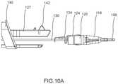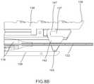 FIG. 8D illustrates a partial cross-sectional view of the region of the assembledcatheter insertion device100 along the center longitudinal plane of thehandle110 following actuation of therelease140 by the practitioner. As shown inFIG. 8D, therelease140 pushes therigid hub120 distally so that the distal end of thejuncture hub118 extends distally beyond theneedle support142. As thejuncture hub118 initially abuts and distally moves past theneedle support142, theneedle support142 swings upward to provide clearance for full deployment of thecatheter group102.