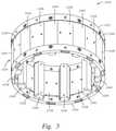 FIG. 3 provides a perspective view of anouter magnet assembly1030 that forms part of theouter magnet array1024. Theouter magnet array1024 may include one or moreouter magnet assembly1030, Theouter magnet assembly1030 may include anupper end band1032 and alower end band1034. Theupper end band1032 and thelower end band1034 may be annular in shape. In some embodiments, theupper end band1032 and thelower end band1034 may be made out of a substantially non-magnetic material. Aring1036 ofouter magnets1038 may be disposed between theupper end band1032 and thelower end band1034 such that eachouter magnet1038 is coupled to theupper end band1032 and thelower end band1034. Theouter magnets1038 may be arranged in thering1036 such that the poles of eachouter magnet1038 are circumferentially aligned. Theouter magnets1038 may be arranged to form thering1036 such that the North pole of oneouter magnet1038 is facing the North pole of a neighboringouter magnet1038. Similarly, the South pole of oneouter magnet1038 may be facing the South pole of another neighboringouter magnet1038.