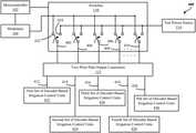 In one configuration, the decoder-basedirrigation control units116 may receive modulated power signals from/through the corresponding two-wire path. In one example, themicrocontroller102 may operate the plurality ofswitches110 to couple and decouple the modulated power signals from an output of themodulator104 to one or more of the plurality of two-wirepath output connectors112. As such, the corresponding ones of the plurality of two-wire paths118 that are coupled with the corresponding ones of the plurality of two-wirepath output connectors112 may receive the same modulated power signals output from themodulator104 whenever the corresponding ones of the plurality ofswitches110 couple the corresponding ones of the plurality of two-wirepath output connectors112 with the output of themodulator104. By one approach, themicrocontroller102 may independently operate each of the plurality ofswitches110 based on instructions received from theirrigation control unit120. In one scenario, when the irrigation control system is operating normally (e.g., no issues, problems, or the like), each one of the plurality ofswitches110 may be coupled with an output of themicrocontroller102. In such scenario, themicrocontroller102 may determine that since each one of the plurality ofswitches110 are coupled with the output of themicrocontroller102, no control signals needed to provide to the plurality ofswitches110. In other scenario, if the irrigation control system experiences issues, problems, or the like, themicrocontroller102 may provide one or more control signals to the plurality ofswitches110 to determine which one of the plurality ofswitches110 to switch over connection or coupling from the output of themicrocontroller102 to thetest power source114. Thus, an irrigation control system including the plurality ofswitches110 enables the irrigation control system to still perform irrigation to areas that are not affected by the issue/problem by independently and automatically cutting off the modulated power signals only to those decoder-basedirrigation control units116 that are affected by the issue/problem while keeping those unaffected decoder-basedirrigation control units116 in operation. Additionally, through the use of the plurality ofswitches110, the irrigation control system is able increase the number of decoder-basedirrigation control units116 supported by a single irrigation controller.