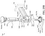 FIG. 22G is another illustrative schematic view of the surgical site, the prosthesis, and the end effector ofFIGS. 22A-22F, shown with the guide moved further away from the surgical site along the trajectory with the flange still engaging the channel and the second trigger, and with the flange disposed out of engagement with the second trigger.