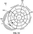 FIG. 15 is a conceptual diagram of a map of a patient's heart in a standard 17 segment view of the left ventricle showing various electrode implantation locations for use with, e.g., the exemplary system and devices ofFIGS. 1-5.