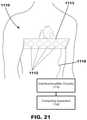 Reference will now be made toFIGS. 20-22, which are diagrams of illustrative systems include electrode apparatus. Anillustrative system1100 includingelectrode apparatus1110,display apparatus1130, andcomputing apparatus1140 is depicted inFIG. 20. Theelectrode apparatus1110 as shown includes a plurality of electrodes incorporated, or included, within a band wrapped around the chest, or torso, of apatient1120. Theelectrode apparatus1110 is operatively coupled to the computing apparatus1140 (e.g., through one or wired electrical connections, wirelessly, etc.) to provide electrical signals from each of the electrodes to thecomputing apparatus1140 for analysis, evaluation, etc. Illustrative electrode apparatus may be described in U.S. Pat. No. 9,320,446 entitled “Bioelectric Sensor Device and Methods” and issued on Apr. 26, 2016, which is incorporated herein by reference in its entirety. Further,illustrative electrode apparatus1110 will be described in more detail in reference toFIGS. 21-22.