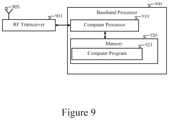 As depicted inFIG. 9, a transceiver configured in accordance with aspects disclosed herein can include a controller, such as at least one computer ordata processor910, at least one non-transitory computer-readable memory medium embodied as amemory920 that stores a program ofcomputer instructions921, and at least one suitable radio frequency (RF) transmitter/receiver901 for bidirectional wireless communications with at least one other transceiver via one ormore antennas905. The exemplary aspects of the disclosure (including those depicted in the flow diagrams and block diagrams) may be implemented, at least in part, by computer software executable by thedata processor910. The transceiver shown inFIG. 9 can be a UE, a base transceiver station, a relay, or some other transceiver.
