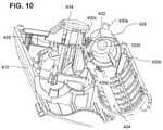 FIG. 4 is a close up dorsal perspective view of a system for aligning a coupling and an access channel of a drug delivery device in accordance with an embodiment of the present invention. In the exemplary embodiment ofFIG. 4, the coupling system of a drug delivery device includes a cannula516 (for example seeFIG. 5). In the exemplary embodiment ofFIG. 3, the neck of the cartridge includes a thin access channel621 (see for exampleFIG. 6) sealed by aseptum420. In the exemplary embodiment ofFIG. 3, the cartridge fitting includes acollar428.Cannula516 is engaged tocollar428 by amount414.Optionally mount414 is flexible. Alternatively or a additionally mount414 may be rigid. The distal end ofmount414 is optionally supported onhousing410 of the drug delivery device by a pivoting connection to abase412. In the embodiment ofFIG. 4,collar428 is movably supported in a ready position onhousing410 of the drug delivery device by one ormore supports430a,430b,430c,430d(for example seeFIG. 5) and430e(for example seeFIG. 7). For example, in the ready position, the opening ofcollar428 is directed toward aguide channel424 so that whencartridge422 is inserted into the guide channel, the distal end ofcartridge422 is engaged bycollar428.