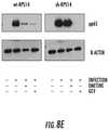 FIGS. 6A-6B: Emetine induces early nuclear translocation of RPS14 followed by late cytoplasmic relocalization and degradation. A) Cells were seeded at 2 million/plate in a 4-well chamber slide, infected and treated with either emetine (75 nM) or GCV (5 M) for 24 h. Cells were stained with IE1/2 (Alexa 555:Red) for evidence of infection and RPS14 (FITC: Green) and nuclear DAPI. Stained slides were subjected to confocal microscopy and colocalization was studied. B) Cells were seeded at 0.5 or 2 million/plate in 100 mm dishes, infected with Towne HCMV followed by treatment with MG132 (10 μM) along with emetine (75 nM) or GCV (5 M) for 72 h. Lysates were collected at 72 hpi and subjected to immunoprecipitation with anti-RPS14 followed by immunoblotting with anti-RPS14 antibody or immunoprecipitation with anti-RPS14 antibody followed by immunoblotting with anti-Ubiquitin antibody.