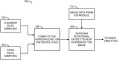 Referring toFIG. 9, a diagram of aprocess300 is shown illustrating a horizon keeping (stabilization) process in accordance with an example embodiment. In various embodiments, the process (or method)300 may comprise a step (or stage)302, a step (or stage)304, a step (or stage)306, and a step (or stage)308. In thestep302, theprocess300 collects G-sensor data samples. In thestep304, theprocess300 collects gyroscopic data samples. In thestep306, theprocess300 computes the horizon level of the drone52 (e.g., roll and pitch angles) based on the samples collected in thesteps302 and304. In thestep308, theprocess300 performs a rotational offset to maintain a horizon of the image represented by the image data received in thestep310 from theEIS portion160. Theprocess300 may be used to implement thehorizon keeping portion162. When the image data has been compensated for orientation with the horizon, the compensated image data may be passed from the EIS andhorizon keeping phase152 to thevideo analytics phase154.