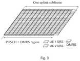 It is noted that UL DMRS and SRS are time-multiplexed into the UL subframe, and SRS are always transmitted in the last symbol of a normal UL subframe. DMRS are used for coherent demodulation of PUSCH and PUCCH data. The PUSCH DMRS is transmitted once every slot for subframes with normal cyclic prefix, and is located in the fourth and eleventh SC-FDMA symbols. SRS is not directly associated with other data or control information, but may generally be used (by the receiving network node, e.g. eNodeB) to estimate the uplink channel quality for purposes of frequency-selective scheduling. In order to serve this purpose, it is necessary that SRS from different UEs with different sounding bandwidths can overlap. As illustrated inFIG. 3, interleaved FDMA is used for SRS with a repetition factor of 2, which implies that in the configured SRS bandwidth, the SRS will be mapped to every other subcarrier in a comb-like fashion.