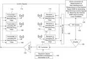 Referring now toFIG. 1, a basic structure of transmitter and receiver units is shown including a feedback structure in accordance with an embodiment is shown. Thus, a signature signal generated at baseband and modulated to aradio frequency100 is provided to anRF combiner102 and amplified byamplifier104. Each of the amplified signals is provided to transmitters 1-m, identified by transmitters,106,108 and110.