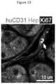 FIG. 19 is a representative image of an engineered tissue seed graft immunostained for huCD31 andKi67 80 days after implantation in mice with regenerative stimuli. The arrow points to a rare double positive cell.