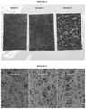 FIG. 6 provides microphotographs of the cross-sections of three samples of the two-layer nonwoven material of Example 2. Each sample was stabilized at a different temperature.