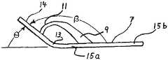 FIG. 8A is a top view of an embodiment of the present invention that is not in use. This view indicates the approximate horizontal direction of the axis BB of the bend or angle in the sole of the footwear that substantially parallels the axis along which a person's forefoot normally hinges relative to the remainder of the foot. The axis BB of the bend in the sole lies in a horizontal plane and is referenced by angle α which would normally be somewhat more than 90 degrees from a vertical, longitudinal, fore and aft, mid-plane A-A passing through the sole of the footwear. This axis also approximates the border between thefore portion14 of the sole, or fore-sole, of the footwear and the remaining portion (or aft portion) of the footwear. As referenced herein, said remaining or aft portion is comprised of aheel section15bof the sole7 and a mid-section15aof the sole7, the mid-section residing between theheel section15band thefore portion14 of the sole7.