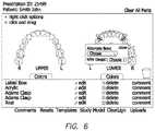 It is important to note that while the canvas32 seen inFIG. 4 depicts the upper and lower teeth as a two dimensional representation or object, in a related embodiment the canvas32 may depict the upper and lower teeth of the patient as a three dimensional model or image. The three dimensional image may be a generic or standard graphical representation of a patient's teeth, or alternatively, a three dimensional image or scan may be taken directly from the patient and then uploaded to the canvas32 to provide a three dimensional representation that is patient specific on which to apply orthodontic or dental appliances, thereby building a three dimensional prescription which is specifically altered or customized for that particular patient.