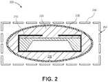 FIG. 2 illustrates an example of a packagedmedical device200 with apressure sensor210, such as the pressure sensor of themedical device110. The packaging can be similarly applied to other components of a medical device including, for example, other types of sensors (e.g., ultrasound sensor, light sensor), actuators, electrical components, electronic components, mechanical components, and substrates carrying such components. Generally, the packaging represents a hermetic biocompatible package that protects a respective component(s) from conditions of an operational environment. This package blocks agents in the operational environment (e.g., contaminants within a body of a subject) from reaching the respective component(s) while still enabling the proper operations of respective component(s). Thereby, the packaging is suitable for long term implantation of the respective component(s).