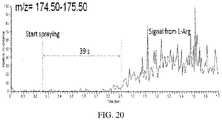 The system dead time can be defined as the lag between the status of the bulk-phase reaction and the time of subsequent mass analysis. L-Arg was injected into E1 (FIG. 19), while solvent (HCN:H2O, v:v=2:1) was added through E2, E3 and E4. The dead time was found to be 20 s at O1, 39 s at O2 and 40 s at O3, as evaluated by observing the time before the emergence of L-Arg in the full mass scan (shown in its ion chronogram,FIG. 20). The dead time suggests that after switching the emitters 40 s delay is required before collection of data for the next time point.