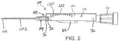 The proximal end of theneedle hub108 preferably carries or supports aflashback plug118. In some embodiments, theflashback plug118 has a wall surface defining aflashback chamber130 in fluid communication with thehollow needle106. For example, anose section172 may project into theproximal chamber166 and around the proximal end of theneedle106. Upon successful venipuncture, flashback of blood flows through the needle and into theflashback chamber130, which is viewable to the healthcare worker. A vent filter, such as a hydrophobic filter, is typically placed at a proximal end of theflashback plug118 to permit venting. In this way, theflashback chamber130 provides a visual indicator that the healthcare worker has properly and successfully inserted the needle into the patient's vein. Theassembly100 can also provide secondary flashback when the user retracts the needle proximally while thecatheter tube102 is in the patient's vein and viewing blood flow in the annular space between theneedle106 and thecatheter tube102. Of course, thecatheter assembly100 can provide alternative or additional visual cues, such as providing thecatheter hub104,needle hub108,cover120, and/or other components out of transparent or semi-transparent materials so the healthcare worker can view flashback of blood through thecatheter assembly100 prior to the blood reaching theflashback chamber130. Theflashback plug118 can contain a seal132, such as a septum or a valve through which theproximal end134 of theneedle106 and/or anchor post162 pass or passes. The seal132 is configured to fluidly seal around theneedle106 and/or the anchor post162 so as to prevent blood from escaping theflashback chamber130 out the distal end of thenose section172. Theflashback plug118 may be permanently affixed to theproximal chamber166 of thecover120 by any suitable mechanism, such as by gluing, welding, snap-fit, or combinations thereof. Theflashback plug118 can instead be removable from thecover120. For example, theflashback plug118 can be removed from theneedle hub108 and subsequently used as a blood sampling source, such as for use to dispense blood samples.