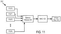 FIG. 11 shows a system for generating a unique key from an output of a MAC that receives inputs from one or more PUF devices selected by a selector module, according to one embodiment.